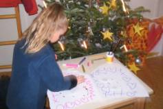 | · | Maak met je handen (ingesmeerd met witte of gele vingerverf) een afdruk op een donkerblauw papier. Dit worden de vleugels. Teken het lijfje en het hoofdje van de engel en plak dat erboven. (Een idee van hoe het moet krijg je op deze site.) |